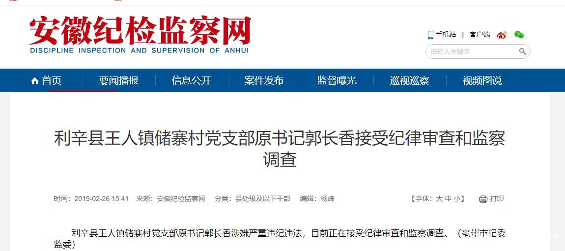 ![]() 利辛縣王人鎮(zhèn)儲寨村黨支部原書記郭長香涉嫌嚴重違紀違法,目前正在接受紀律審查和監(jiān)察調查。 |